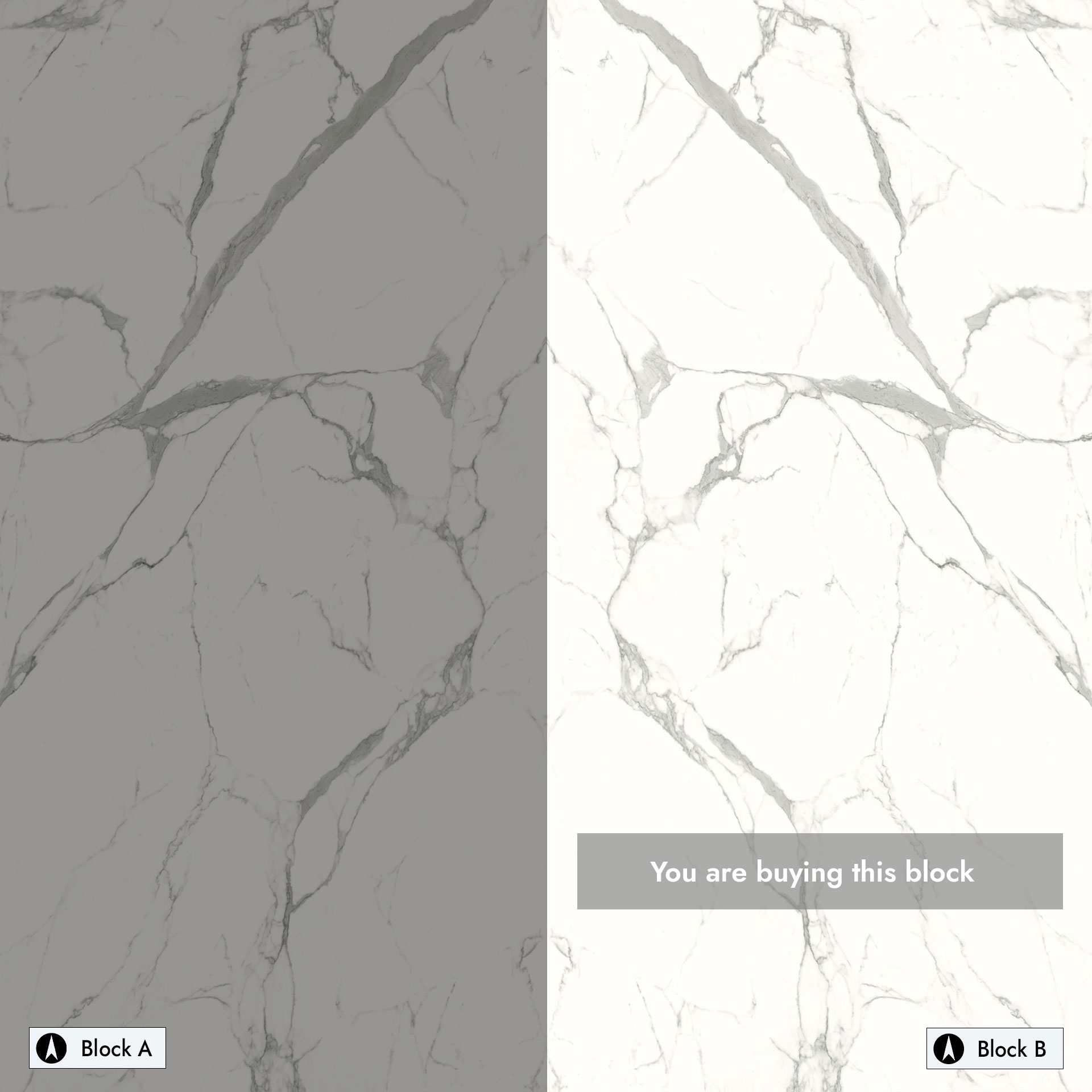 Marble effect large format porcelain slabs with a white polished finish. Priced at £105.84 per m². We have good stock levels available, please select required quantity. This item has now been sold. See additional stock below. Please note this is a bookmatched item that requires both Block A and Block B to create a bookmatched pair. You are buying Block B. See matching Block A to complete the pair. Subject to availability.