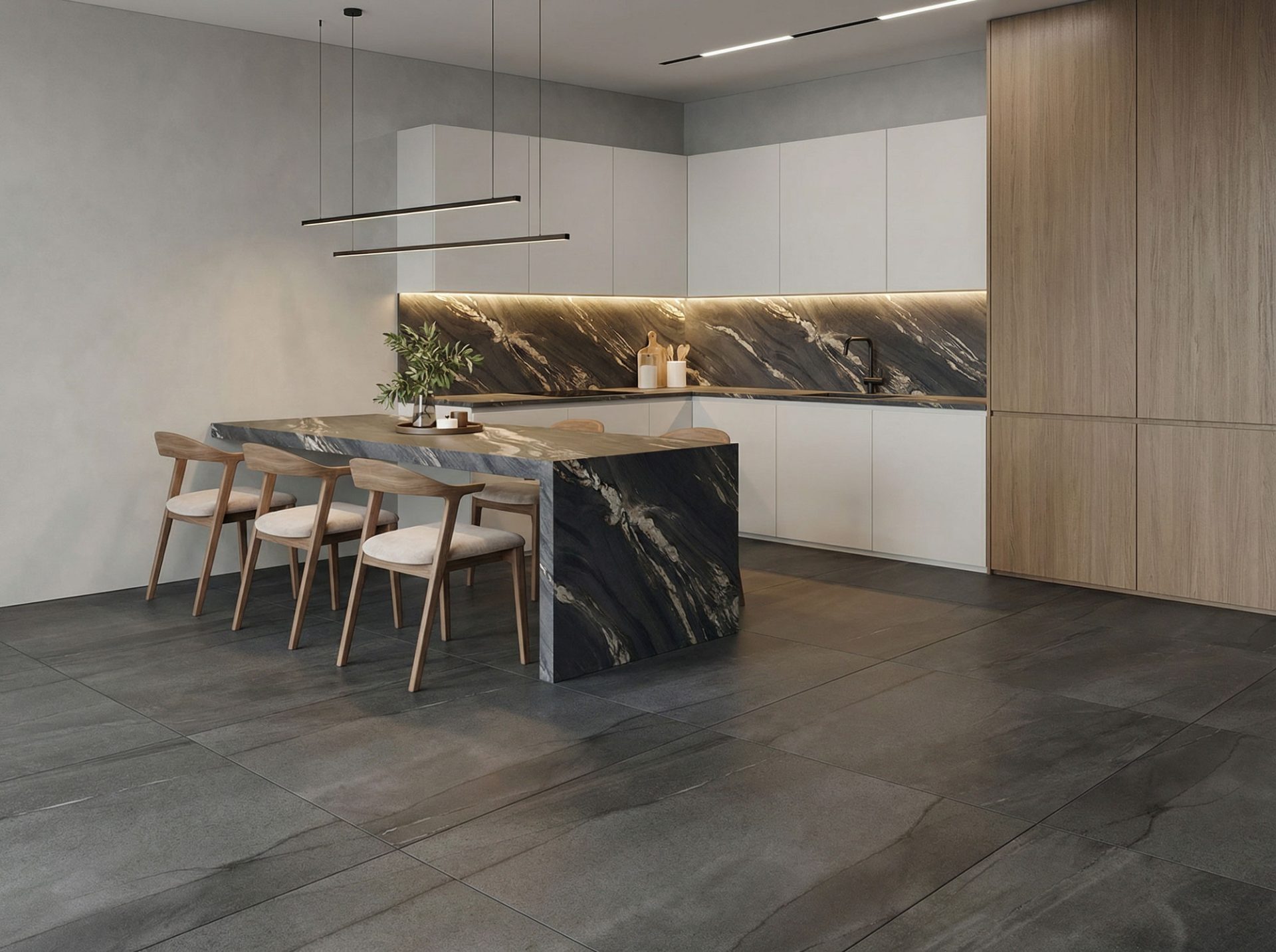 Unlike many natural materials including wood, stone and marble, porcelain is entirely non-porous. This provides an extremely hygienic, anti-bacterial surface that is ideal for food preparation. It has a durable, non-scratch finish that is heat and blade resistant, and does not require sealing like granite or marble. The surface offers protection against mould and mildew that cause odours, while coffee, red wine or tomato based sauces will not stain and cleaning products are safe to use. A comprehensive cleaning routine will help to keep your surfaces in tip-top condition and ensure their continued beauty for years to come. See here for more information regarding the cleaning and maintenance of your porcelain tiles.